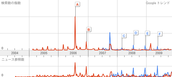 分かりづらいと思いますが、両者が検索結果に登場した年、